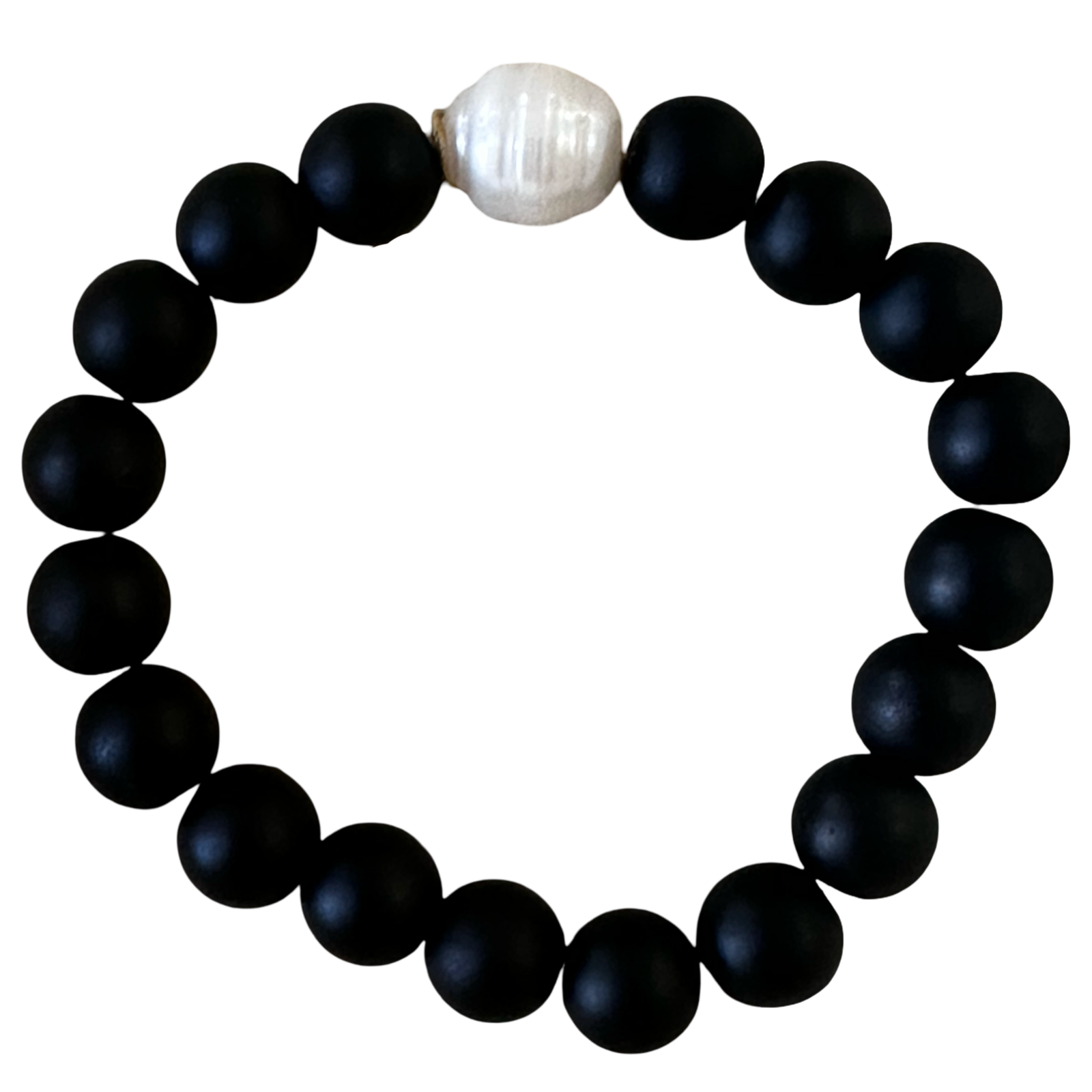 This handcrafted bracelet combines sleek black beads with a single lustrous freshwater pearl for a modern monochrome look. Designed for easy slip-on wear, it’s perfect to stack a few for a maximum effect.