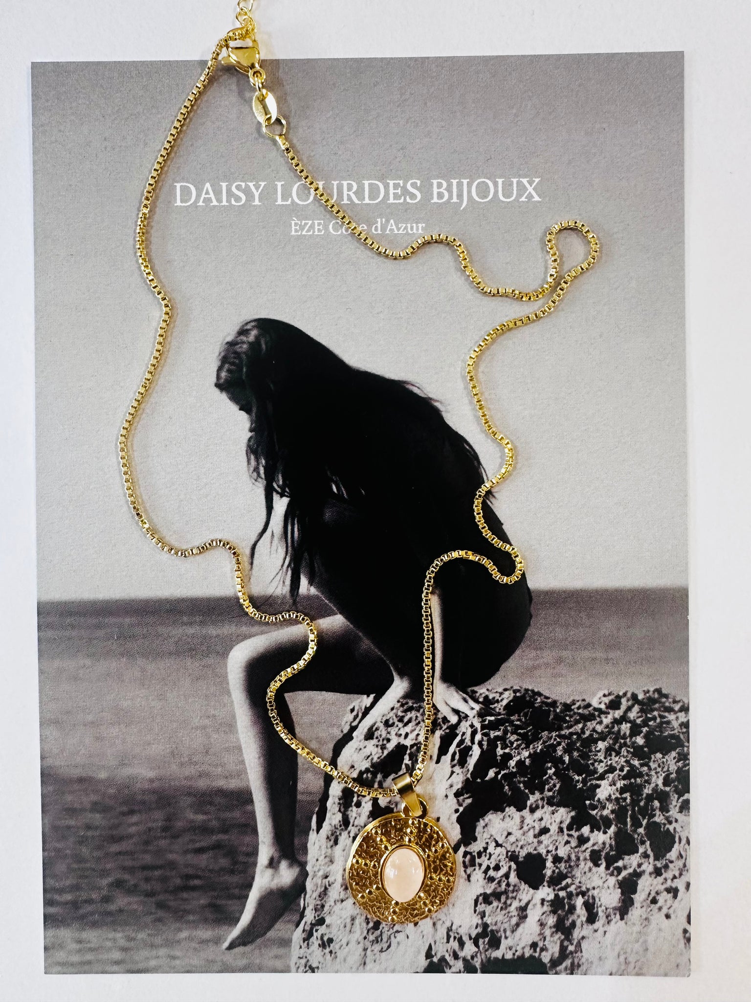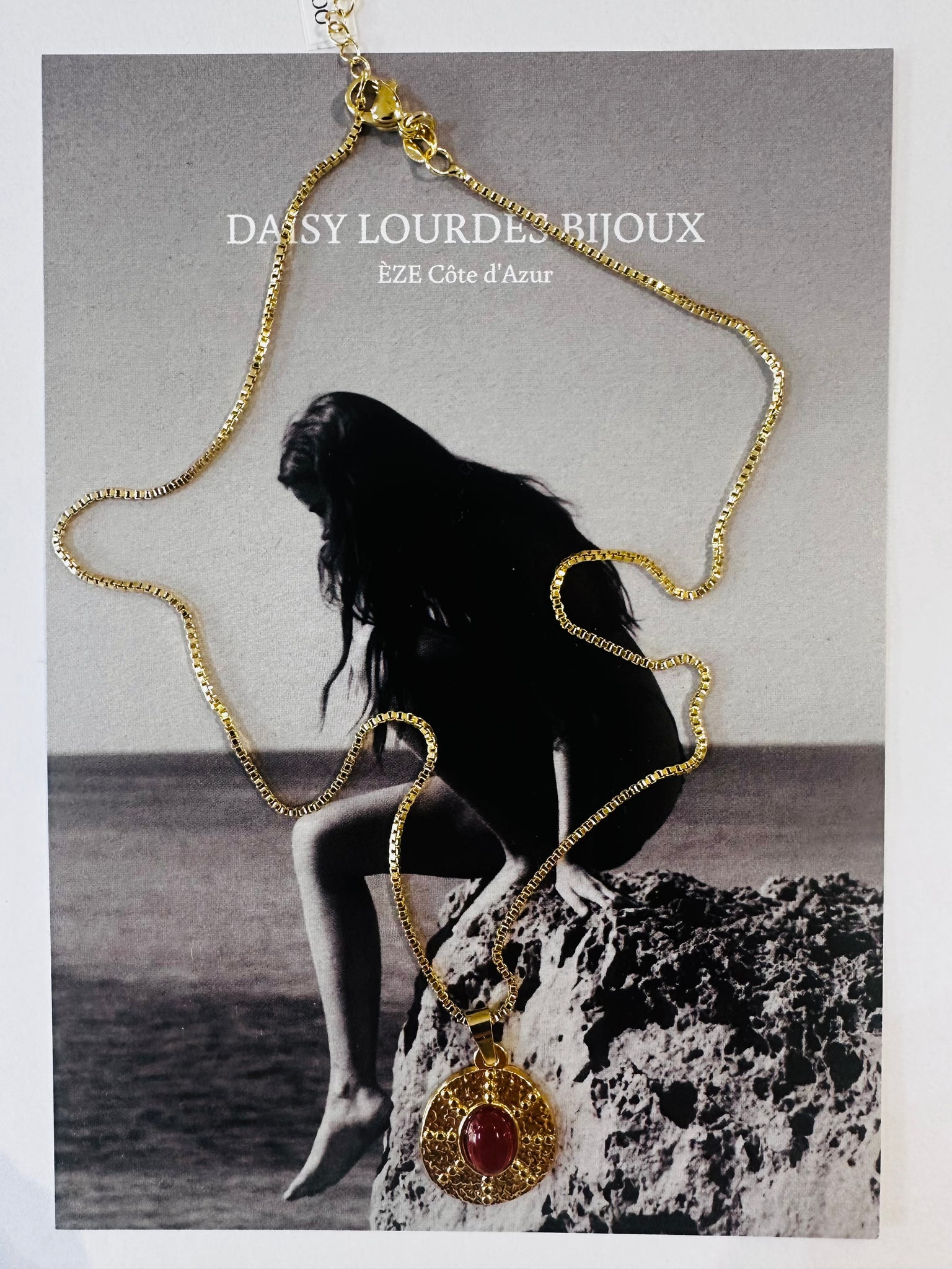 The ST JEAN PENDANT NECKLACE uses a fine box chain made from surgical grade stainless steel and coated in 18k gold. Each is adorned with a framed pendant in a choice of stones.