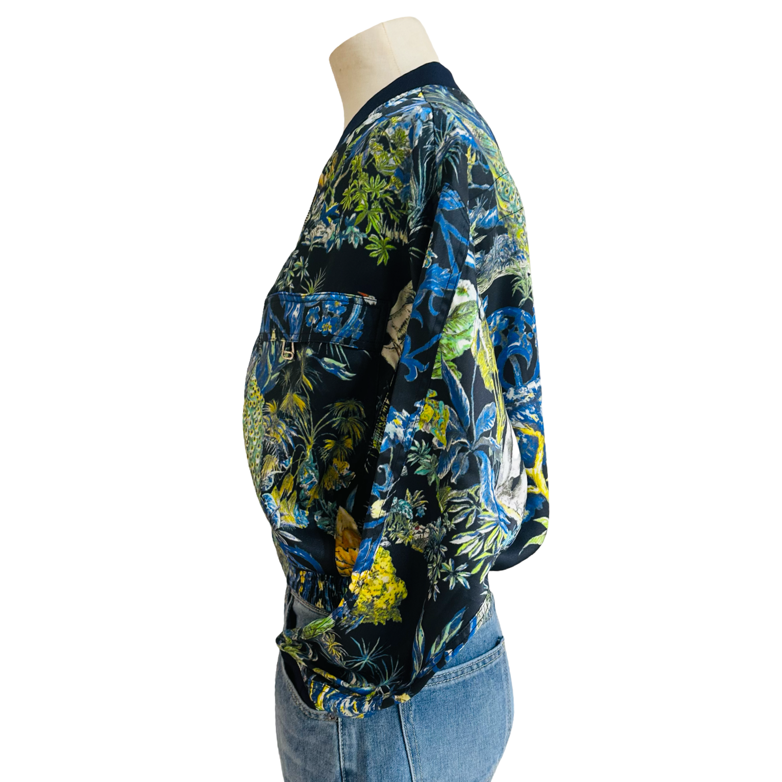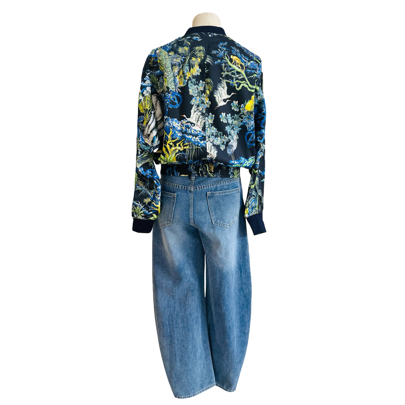 The SARAWAK BOMBER combines incredible construction with a modern bomber silhouette and elegant sculptural sleeves. Crafted from satin adorned with a striking jungle print, it features a convenient zip-front closure, delivering both style and comfort in one standout piece.
