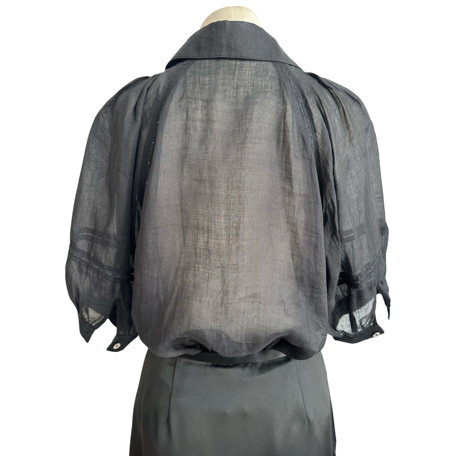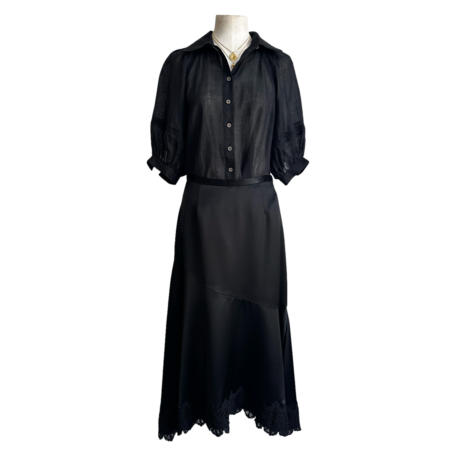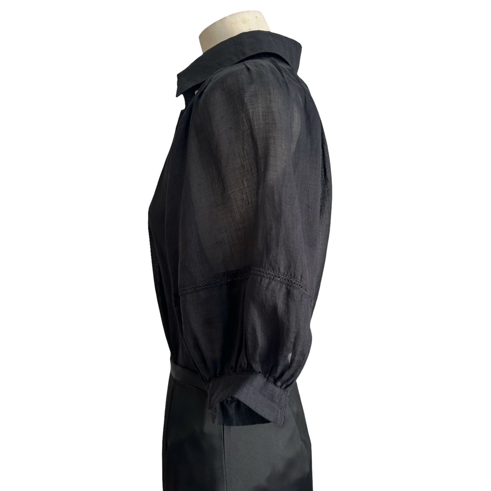 The Temple Blouse in black exudes romantic charm with its sheer loveliness. Featuring delicate pleated shoulders and billowy sleeves, it offers a graceful silhouette that effortlessly transitions from tucked in for a polished look to left out for relaxed elegance. This versatile blouse adds a fresh, modern touch to any wardrobe.