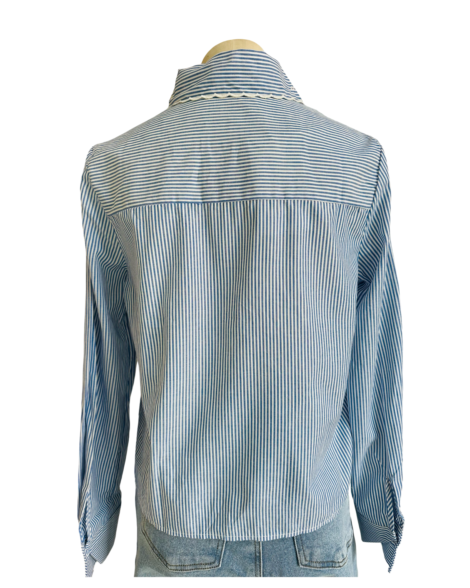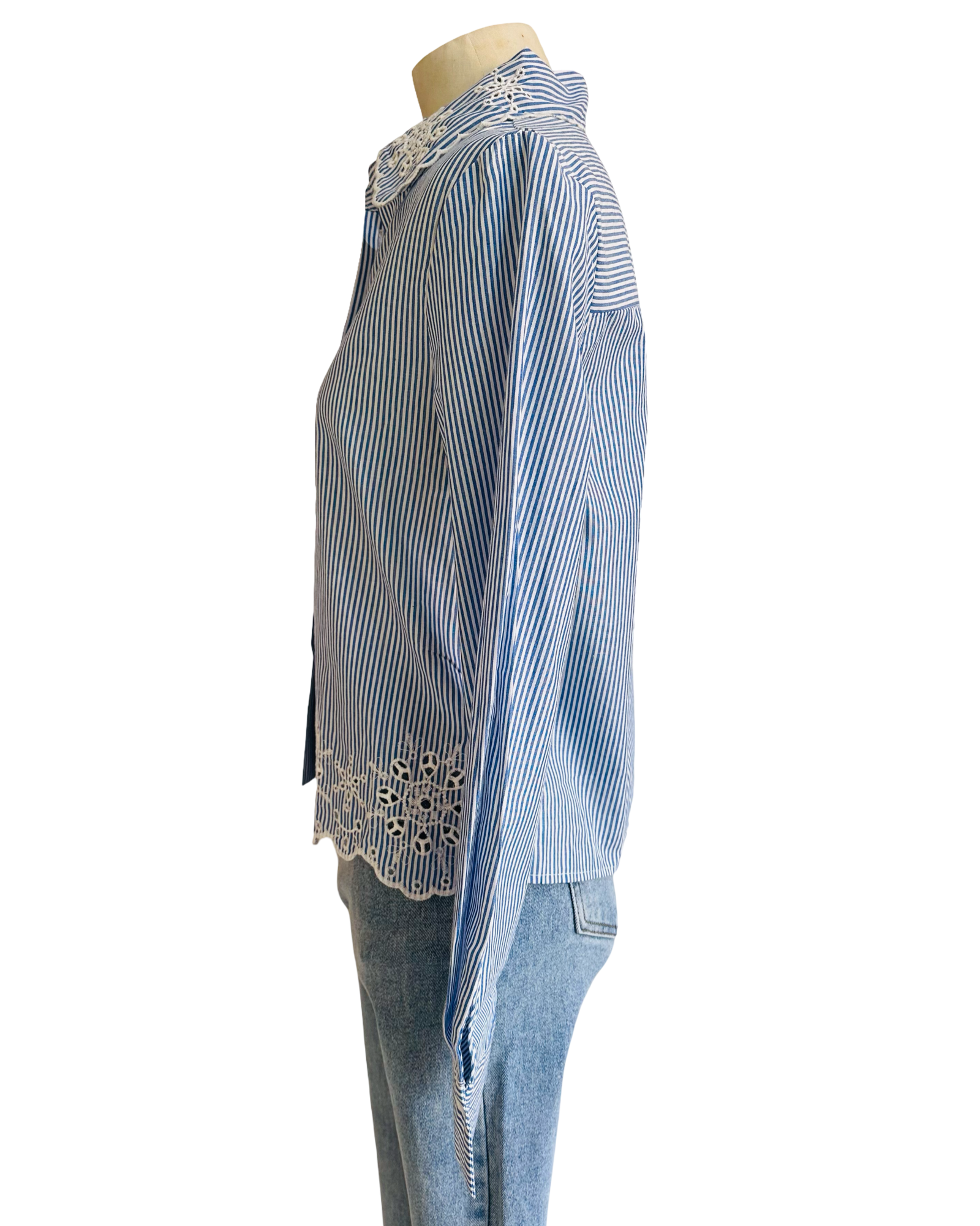 The Claudine Shirt is a lightweight summer essential, crafted with blue and white fine stripes for a crisp, modern look. Featuring a delicate lace cut-out collar and border hem, it combines airy comfort with subtle elegance. Perfect styled back with denim or white linen.